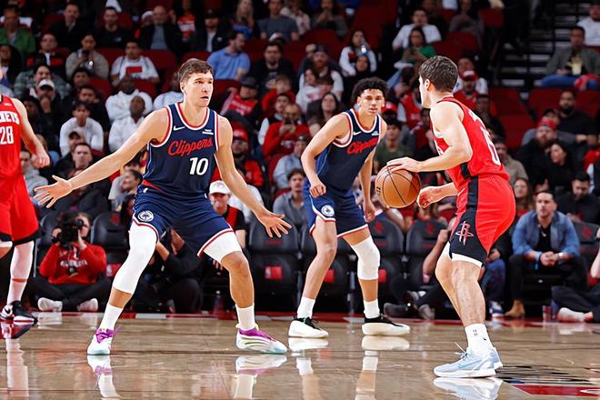 本场比赛中,快船的替补后场大将博格丹-博格达诺维奇(Bogdan Bogdanovic)的表现其实还算不错。博格达诺维奇全场出场24分22秒,投篮4中2,三分线外3中2,罚球4中4,得到了10分5篮板2助攻1抢断的数据,还有2次犯规,正负值为-2。博格达诺维奇没有得到太多的出手机会,但是他还是展现出了自己的投射能力,他也是具备一定的持球进攻能力的,他也能够完成一些支配球和分享球,他在进攻端的功能还是比较全面的。博格达诺维奇在防守端的贡献度比较有限,他的个人防守能力也比较一般,但这一点也是大家都知道的事情。其实博格达诺维奇也算是快船阵容中为数不多的几个具备不俗个人攻击力的球员,也是火箭感到有些不太好防守的球员,可惜他的战术地位还是低了一些,他也没有办法发挥出更大的作用。
