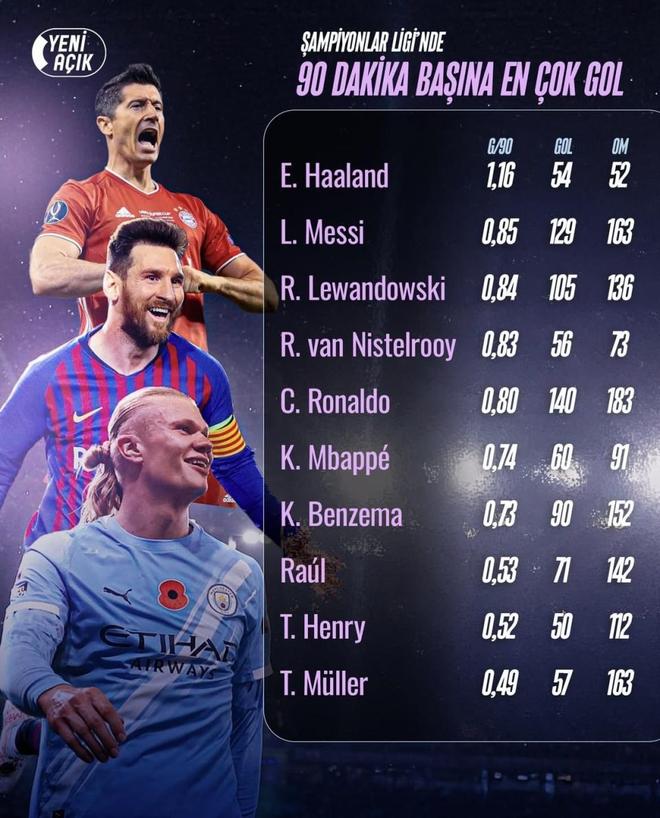 最近Yeni Açık发布了欧冠每90分钟进球榜单,哈兰德、梅西、C罗、莱万这些熟悉的名字全部在列。榜单前十里,哈兰德的效率已经甩开前辈一大截,而内马尔、萨拉赫等热门前锋暂时都没挤进来。就在欧冠改制、强队场次变多的背景下,这组数字也把一个老问题重新推到桌面上——在这样的环境里,哈兰德到底有多大机会把C罗的欧冠进球纪录彻底赶超?